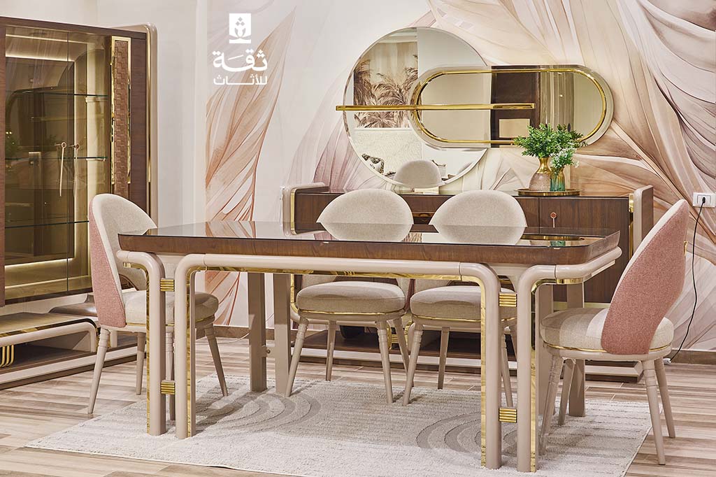 لدينا في ثقة للاثاث غرفة سفرة كاملة و سفرة نيو كلاسيك و سفرة مودرن ٦ كراسي بالاضافه الي كتالوج غرف سفرة مودرن 2025