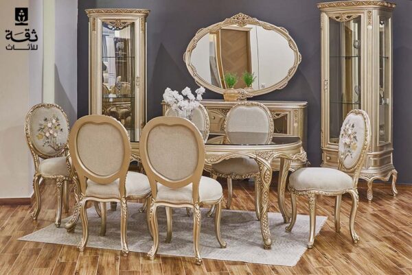 سفرة ليالي نيوكلاسيك هي حجره سفره كامله بتصميم أنيق، مع كراسي هاند ميد تجمع بين الحرفية والجمال لتضفي لمسة فاخرة على كل زاوية.